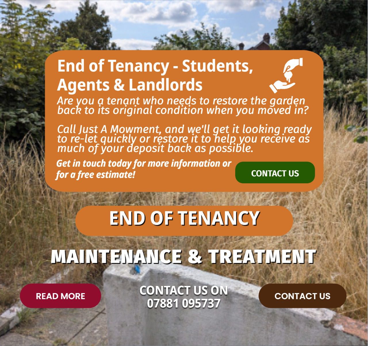 Are you a tenant who needs to restore the garden back to its original condition when you moved in? Call Just A Mowment and we’ll get it looking ready to re-let quickly or restore it to help you receive as much of your deposit back as possible.